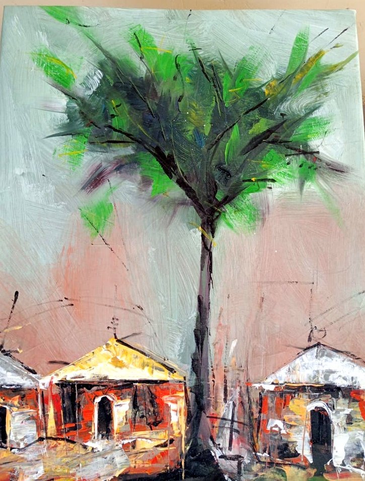 This 29×22 inch framed abstract artwork captures the quiet beauty of a village scene beneath a tall, expressive tree. Vivid green brushstrokes form a lush canopy, contrasted by the warm oranges, yellows, and whites of the village houses below. The painting’s textured strokes and contemporary style add movement and depth, making it an eye-catching piece for any room.