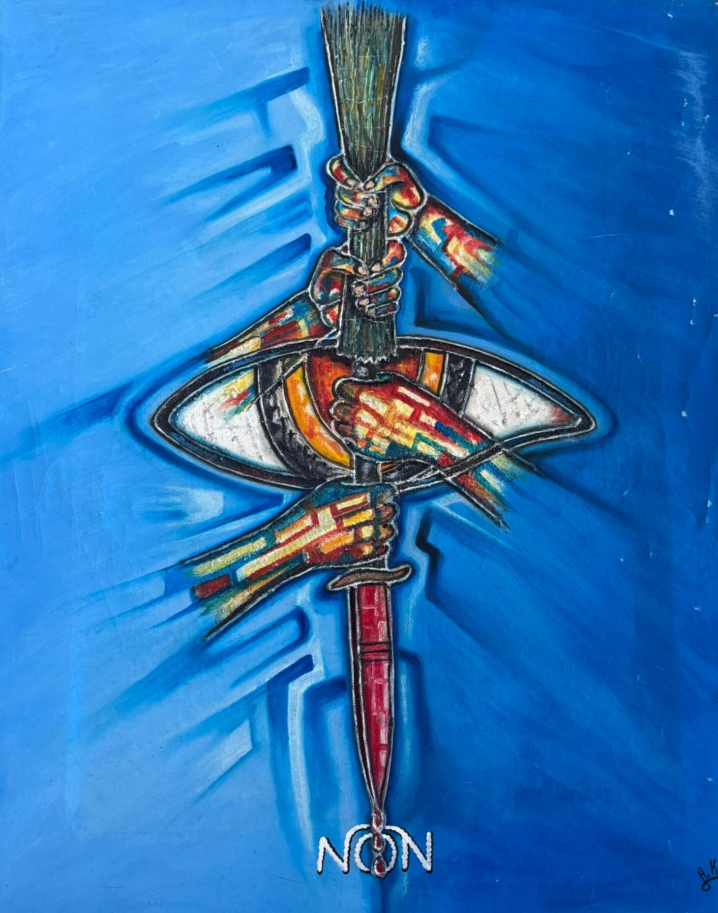 The interplay of colors and symbols in this Ghanaian abstract work showcases the artist’s extraordinary ability to weave a narrative on canvas. The hands symbolize creativity and control, while the eye suggests perception, awareness, and vision. The crimson point acts as an anchor, immersing the viewer in a dynamic tension that is uniquely emotive. The electric-blue backdrop amplifies these elements, making this piece an arresting centerpiece in any room or collection.