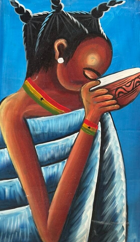 Art That Captures Tranquility Immerse yourself in the serene beauty of this stylized portrait, where a young woman, cloaked in soft, flowing indigo cloth, pauses to savor a peaceful moment. The piece masterfully blends tranquility and cultural richness, inviting you into a world where artistry meets quiet introspection. A Celebration of Ghanaian Heritage This artwork […]